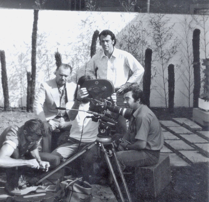 - Sérgio Hingst, Aldir Mendes e Antônio Meliante durante as filmagens de O Trote dos Sádicos. Dir. Aldir, 1974
