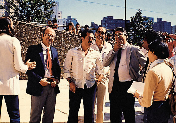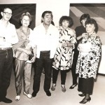 - 1985. Solange Mendes de Souza, Aldir, Hermelindo Fiaminghi, Mário Schemberg e Neide Bonfiglioli durante a exposição Geo/Metria